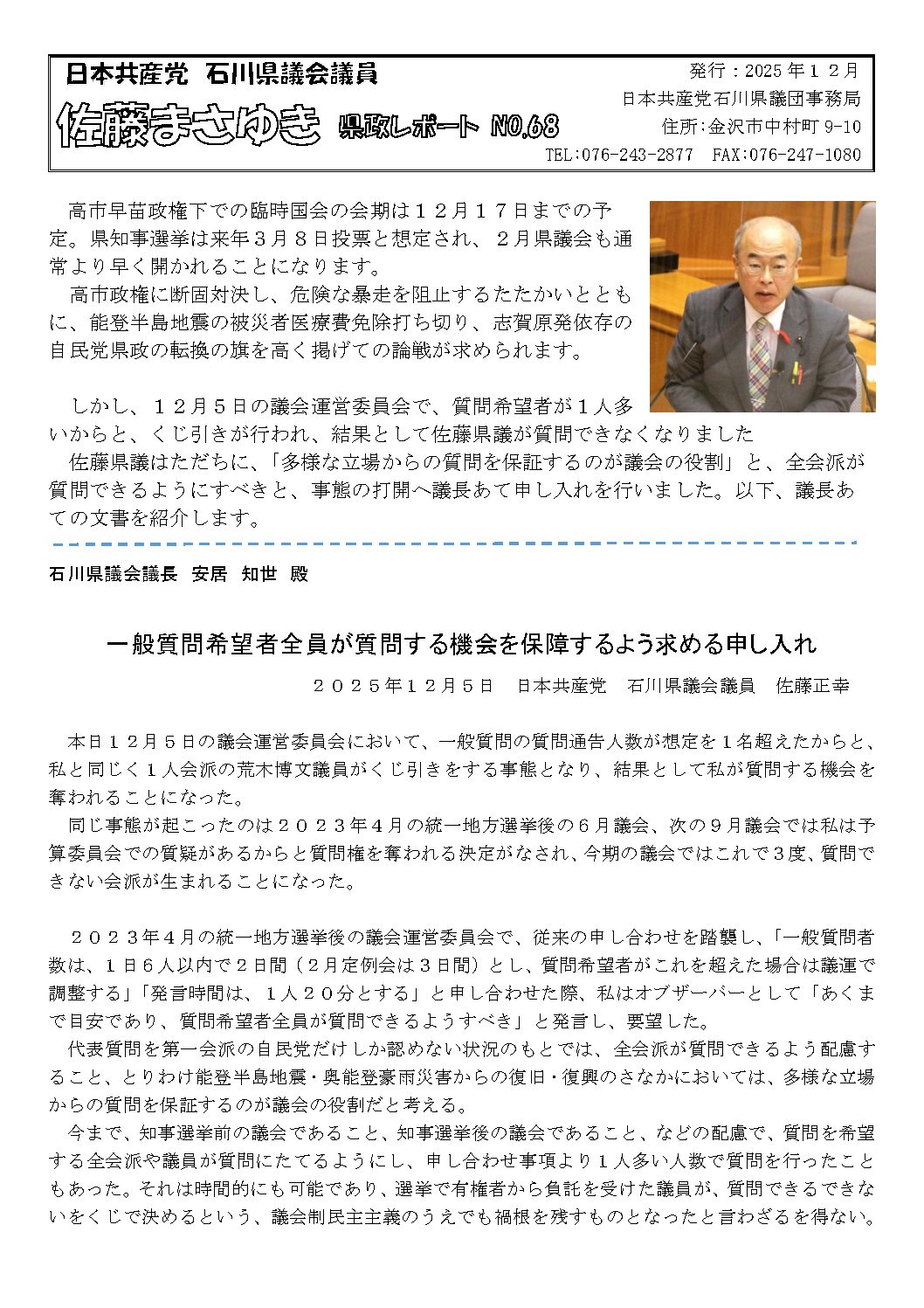 県議会2025年第3回定例会(9月8日~30日)が開会しました。佐藤県議が9月19日(金)質問に立ちます。ネット中継は〝石川県議会 生中継〟で検索してください。質問の柱(予定)は、「県政レポートNO.67」をご覧くださ ... 続きを読む →